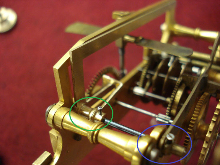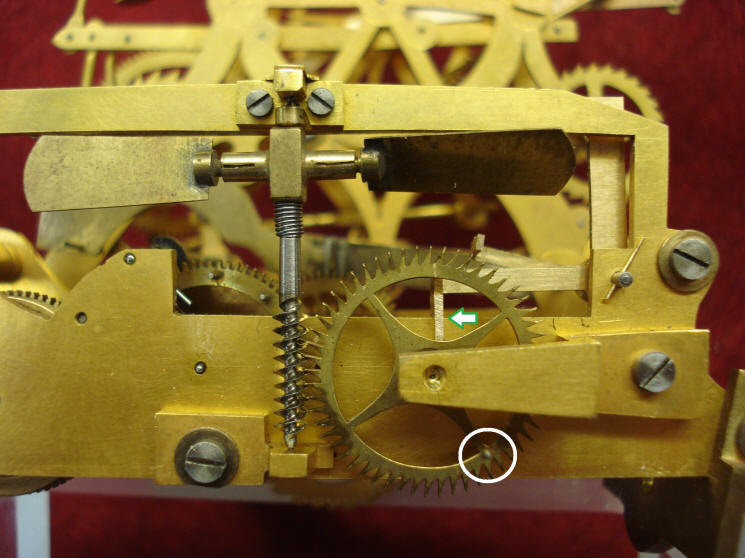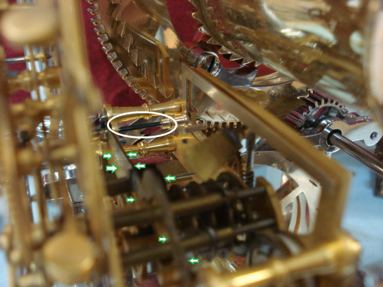 view of the new Easter warning mechanism. The green circle shows the two new parts mounted to