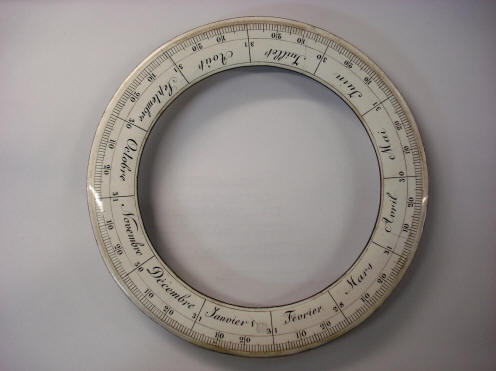 view from the top of zodiac ring support dial. The brass four spoked wheel,