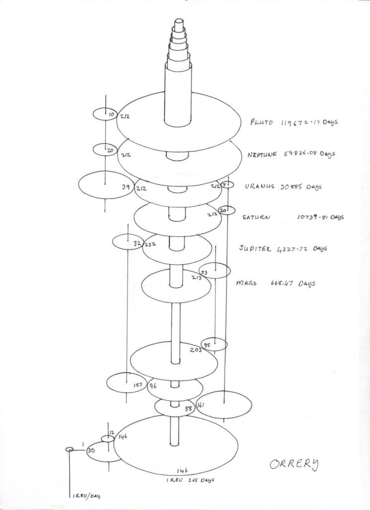 drawing shows the orrery details for the inner planets of Murcury and Venus.