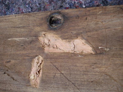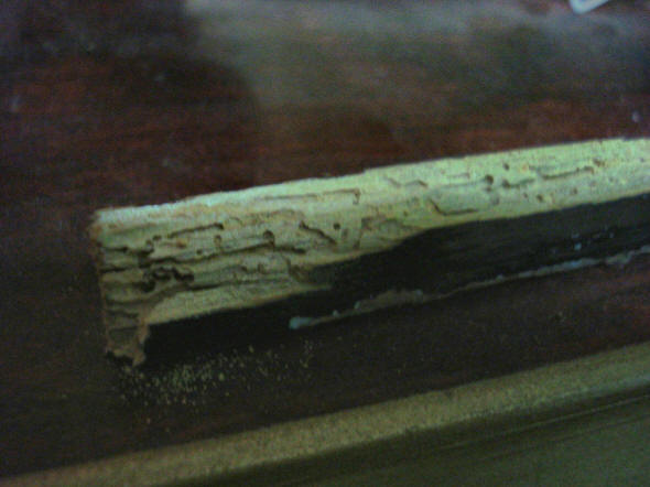 section of wood that had come away with extensive wood worm damage. Notice