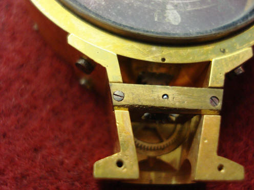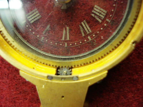 A close up view of a screw that attaches a bridge inside the mystery dial.