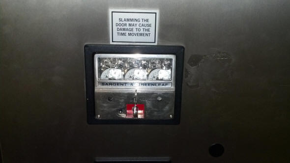 A. A modern version of the 6300 series. In the later half of the 20th century many manufacturers cut costs by dispensing with the metal door and replacing it with a screwed on plastic (or in this case combination metal / plastic) cover; often with integral lenses for easier reading of the dial. c. 1984. Below is a Diebold vault door with a #6300 timer. file 61
