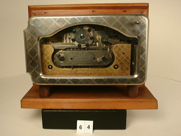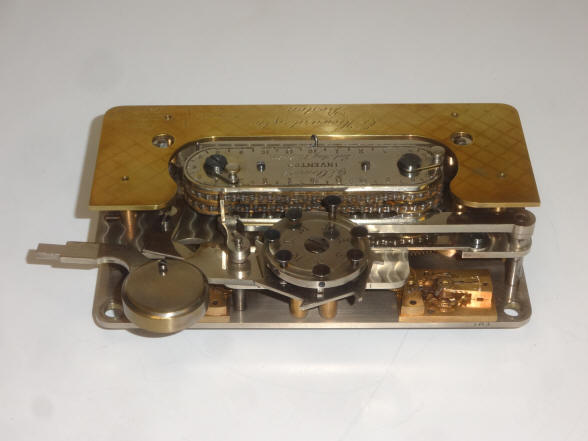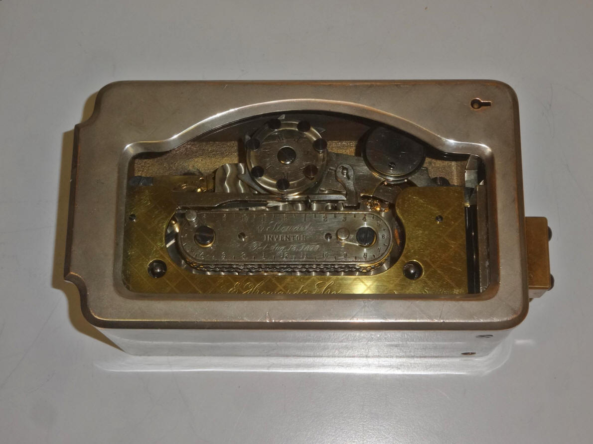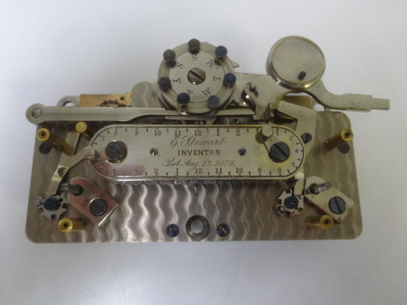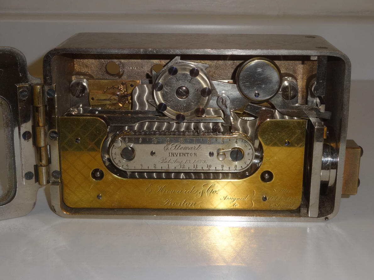 One thing that stands out here is the fact that the patent papers show the patent date as August 13, 1878, but the engraving on the central name plate states "August 13, 1879". Surely this was an engraving error on the part of the E. Howard company. It is simply too coincidental of the year transposition to be anything else. The other four examples known to exist have this same error so it appears that the original and as it turned out only, order of twenty of these locks from E. Howard in 1882 all had the same mistake. The Stewart time lock was available in both bolt-blocking (this example) and bottom-releasing formats. The late 1870's that saw a raft of new time lock designs patented and made, not only by smaller lock makers such as Lewis Lillie and Fredric North's New Britain Bank Lock, maker of the Pillard time lock, but tiny , new companies with little more than a new or good idea. One such design was was the Stewart time lock that let the mechanism lock and unlock automatically for a set period each day as well as intraday periods and skip its opening periods on the days set on the calendar wheel at the top center of the lock. (1) The Mosler calendar time lock could also perform all three functions. Of the four known examples to have survived, all are the bolt-blocking type. One is in the Mossman gallery within the collection of the General Society of Mechanics and Tradesmen in New York City, one in the Harry C. Miller Museum in Kentucky and two in private hands. Movements #101, Case #1, 7"w x 4.25"h x 3"d. file #188