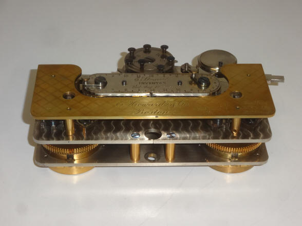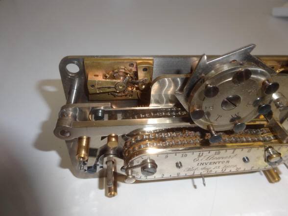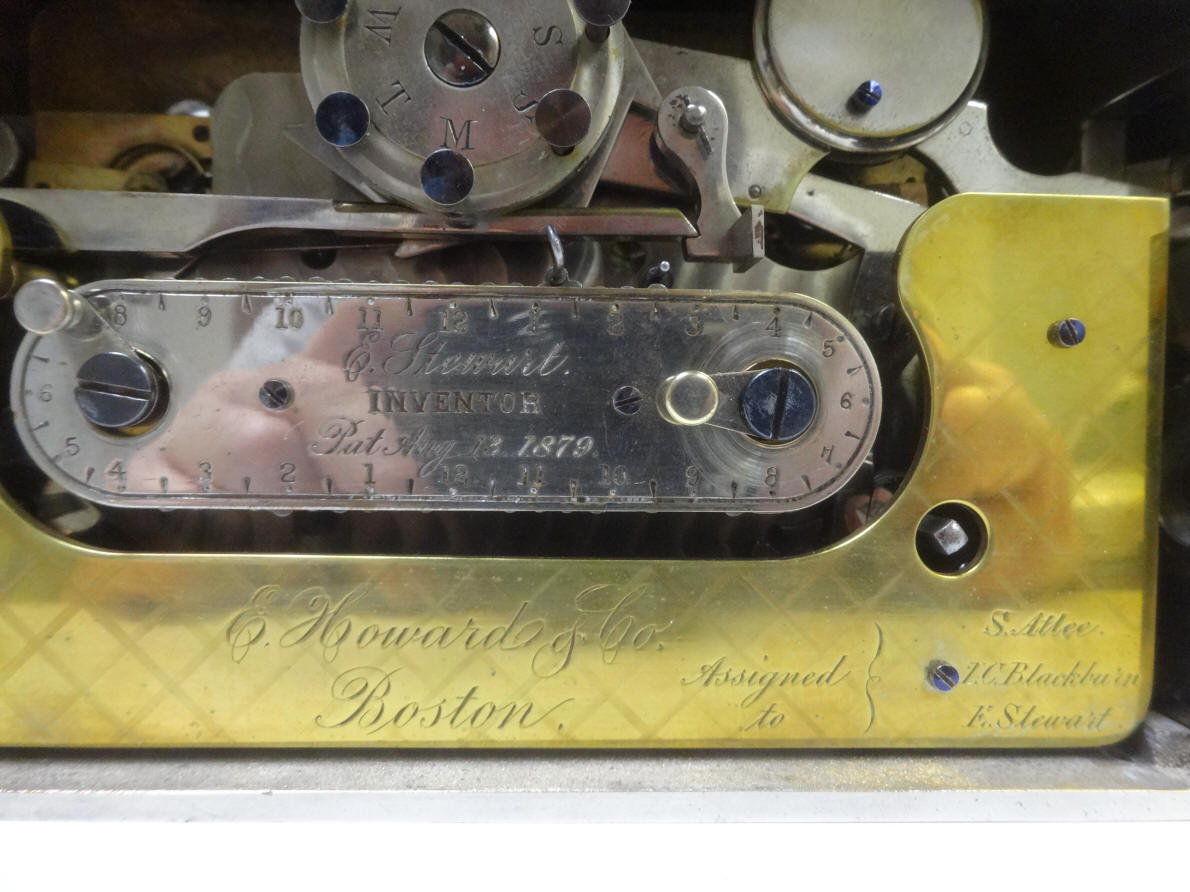 Close up of the dual chain drive and weekly calendar mechanisms. An explanation and demonstration of how these work is illustrated in the video below. The brass plate indicates E. Howard made the time lock with the names of the company's co-owners, Samuel Atlee and Jacob Blackburn. (1) The central oval name plate has a patent date exactly one year in variance with the filed patent papers illustrated below. The diamond machined pattern is duplicated on the case, although it is somewhat faded. Howard used this design for other time lock makers who had turned to them for manufacture. Some examples are the Holms Electric Time Lock Co., Hollar Time Lock and Yale & Towne Manufacturing Co. While Stewart as well as Holms and Hollar were very short-lived companies, Yale survived to be, along with Sargent & Greenleaf, one of the largest and most prolific time lock makers. Yale used this pattern on most of their earlier nickel plated cases for decades. The camel back window design as well as the door hinge configurations of the Stewart are nearly identical to the Holms cases.
