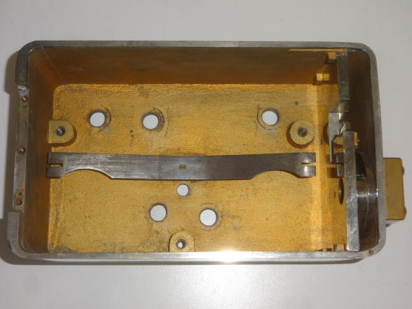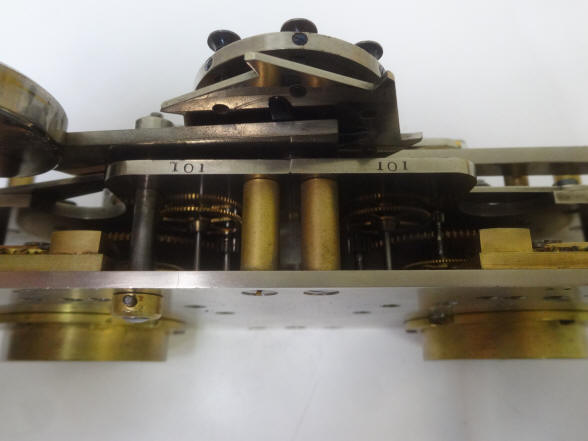 The long metal strip serves as a fairly rudimentary shock absorber. Most time locks used some form of shock resistance from very early on. Once robbers knew that the safe could not be opened by the firm's personnel they turned to brute force. Without some form of cushion, the delicate balance wheels could easily become deranged or damaged resulting in a permanent lockout. Later most time locks employed springs split on both sides of the time lock movement plate for a far better shock resistance. The next photo shows the movement numbers as 101. Often the movement numbers began at 101 or in the case of the Consolidated Lock Co, 1001. The case also is stamped #1 leading me to believe this was the first production model made.