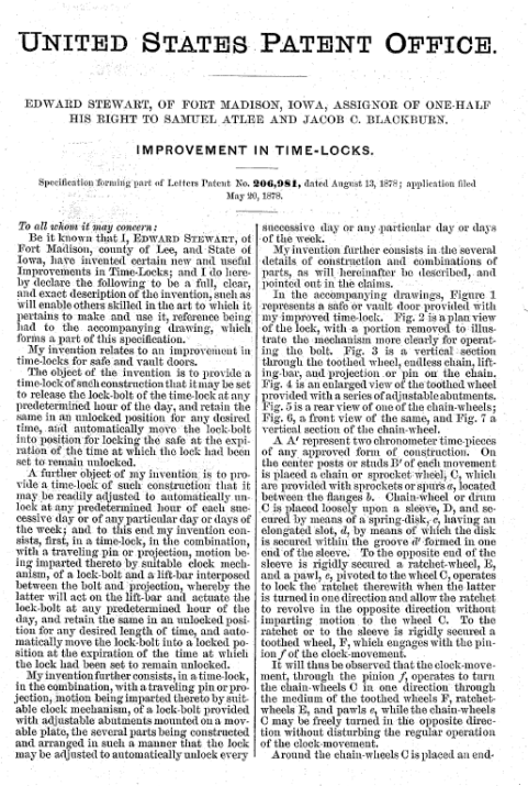 Edward Stewart's time lock, Stewart Time Lock Co., Fort Madison, Iowa - 2 movements