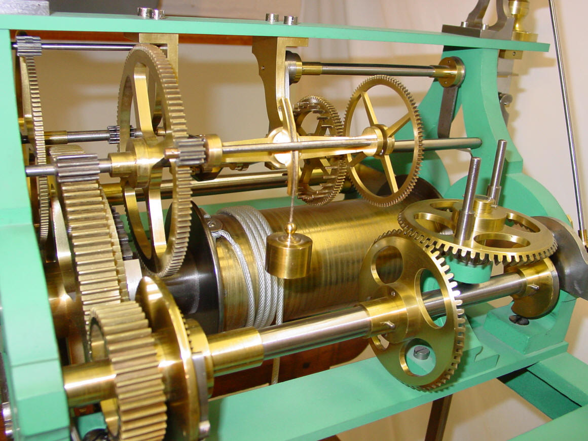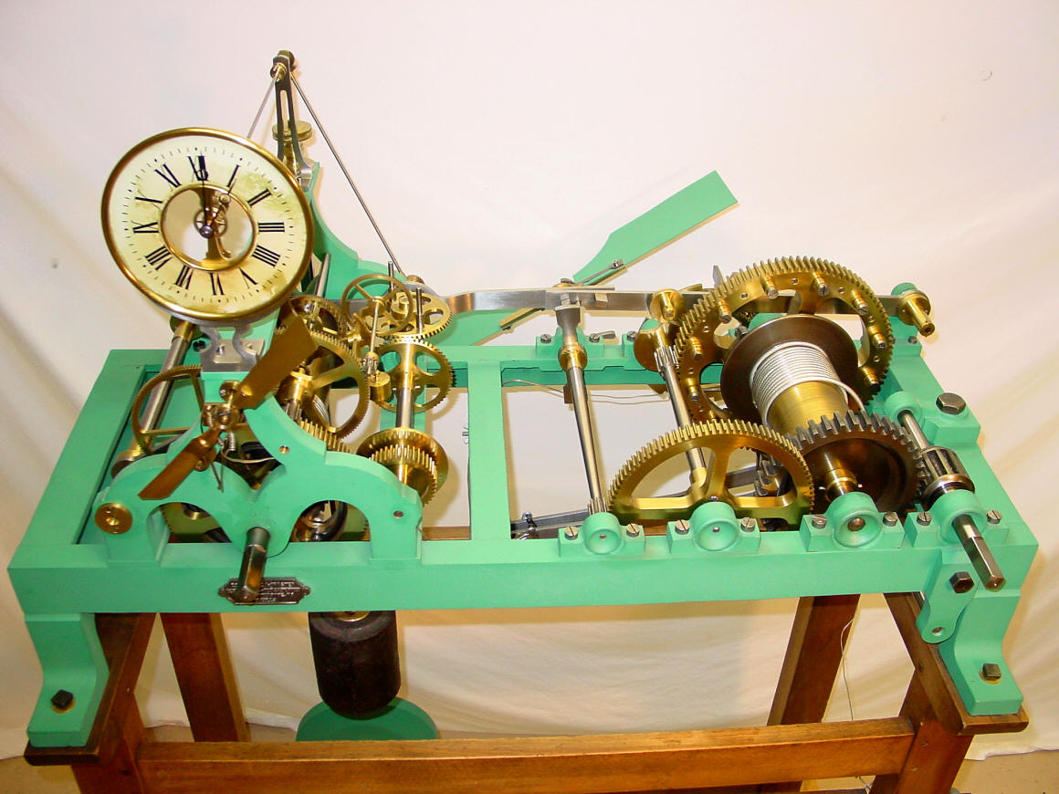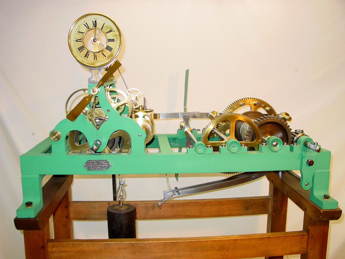 Bernard-Henri Wagner A brief discussion on remontoire below; and for further information, examples, pictures and drawings of different remontoire access the author's lecture notes. This movement employs a gravity driven train remontoire. A remontoire, from the French word 'remonter' (to wind), is a constant force device used in a timepiece whereby the main source of power periodically winds a spring or lifts a weight to drive the timepiece's escapement. A train remontoire is employed beyond the actual escape wheel - usually the next wheel down the going train. This arrangement normally employs a gravity driven remontoire. The purpose of a remontoire in a tower clock is two fold. First is to mechanically isolate the escapement from the rest of the movement. This prevents variations and stoppages that might occur due to the environment that a tower clock must work in. Wind and weather such as ice and snow acting upon the large clock hands on the outside of the tower will be transmitted back through the linkages toward the movement and its' escapement. The second is to supply a smooth, constant source of power to the escapement. Large seasonal temperature variances will cause differences in oil viscosity throughout the wheel train and is multiplied as the number of wheels and linkages increase. A remontoire keeps this number to a minimum by providing a power source close to the escapement independent of the rest of the movement rain. Most tower clocks do not have a remontoire as this device added to the expense of manufacture and required more careful and experienced people to maintain. Nearly all makers chose to overcome the the above mentioned difficulties by brute force; employing heavier weights and robust wheel trains. An alternative, but less elegant solution. Remontoire come in a wide variety of mechanical styles, and complexity. They can generally be divided into two categories. The first is the spring style; where a small spring is used as the motive of power to the escapement. This is normally attached directly to the escape wheel. The second is a gravity driven style where a small weight drives the escapement usually from the next wheel down the train from the escapement. Each of these styles can operate as a train or escapement type. However in the majority of cases gravity remontoire operate as train remontoire and spring remontoire operate as escapement remontoire. Both spring and weight styles are periodically rewound or lifted by the main weight or spring of the clock movement. This device has also been used in some clocks to overcome the problem of diminishing power being delivered to the escapement as the main spring unwinds. The main spring will drive a gravity remontoire effectively turning a spring driven clock with its advantage of portability to a weight driven clock with its advantage of a constant force of gravity. In addition are the advantages of isolating the escapement from the rest of the movement. Alternatively, a fusee was commonly used to overcome the spring problem, and was much simpler and cheaper but not quite as accurate. Nor as interesting to watch! The gravity remontoire was invented c. 1595 by Jost Burgi, Swiss (1552-1631) and is also known for his invention of the cross-beat verge escapement. These innovations made his clocks the most accurate mechanical timekeepers of their day. The second class of remontoire, the spring driven type, was invented by John Harrison during development of his H2 marine timekeeper in 1739. This, in conjunction with other innovations in his H4 model of a ships' chronometer, won him the Longitude Prize in 1773. A clock incorporating a remontoire is actually supplying power split between two mechanisms. One is constant - the remontoire supplying the escapement. The other is periodic and only operates to rewind the remontoire and advance the clock hands forward. Click here to view an animation. Other examples of the Bernard Henri Wagner train remontoire are found in the Dent exhibition clock and Collin-Wagner master clock both in the skeleton clock section. Other gravity driven train remontoire are exemplified by the differential remontoire in the Korfhage 3 train, Korfhage two train, Schneider and Horz and an alternative form of differential in Borrel-Wagner. A Robin endless chain style gravity remontoire is illustrated in another Horz. Other examples of gravity driven remontoire are found in the Perrot and Addicks. An unusual gravity driven escapement type is in Seybold. The other main type of remontoire, the spring driven escapement remontoire, is illustrated by the Schwalbach. Also the Dent, Concord in the skeleton clock section. The Denison style double -three-legged gravity escapement is also a type of escapement remontoire as are many others such as Hardy's spring escapement, (detailed in lecture notes). A movement equipped with a remontoire is fascinating to watch, as there is a periodic movement of the rewind mechanism usually mediated by a fly fan (air brake) that spins around. For many more pictures of this tower clock and it's step by step restoration process, go to the beginning of this web site's home page and click on the "Tower Clock Restoration Page" picture, or just click here. |