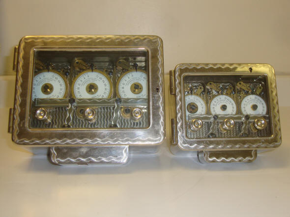 Model Triple P, c. 1895. This lock used the largest movements made by Yale, the size 'M' movement. The 'P' designation is used for the three movement version of the lock that was employed with an external bolt motor. The four movement version was designated as Quadruple N. According to a Yale catalog from the late 1800's the Triple P was a special order item only. The release for that motor is located in the bulged area at the bottom of the lock (see second photo) as opposed to the Triple O which had the conventional bolt dog for manually operated vault door bolts. These were Yale's largest time locks for use with large safes equipped with automatic bolt motors. In nearly all respects it is identical in appearance to Yale's most popular time lock, the Triple L, which used the next smaller movement in size, the 'L' size to control smaller automatic bolt motors. Case #114, movements #1799, 1800, 2124. 7" x 6 1/4"h x 3 3/8"d. file 171 Below a Triple P mounted to a Diebold vault door on top of the bolt motor mechanism.