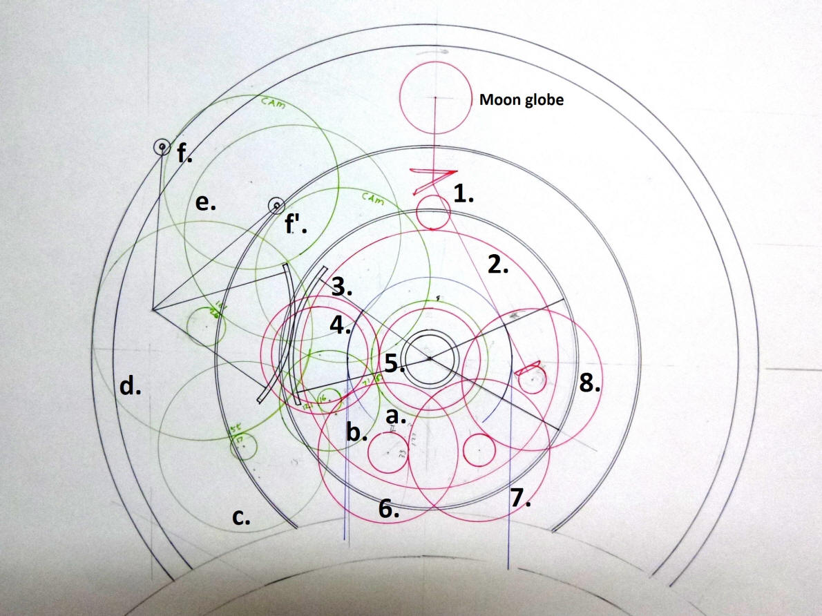 rotating the large red wheel upon which the rest of the moon mechanism is