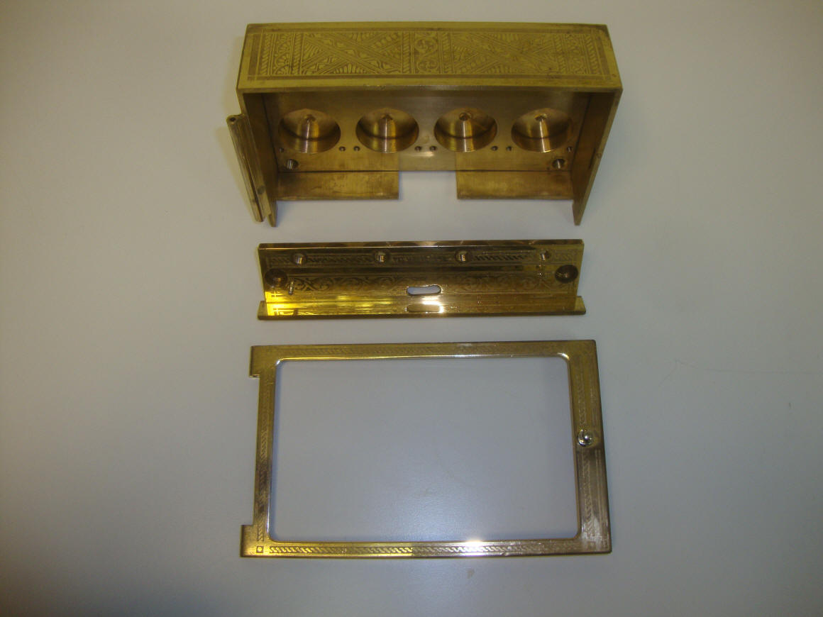 second photo. The designs were acid-etched and gold plated. Sometime after