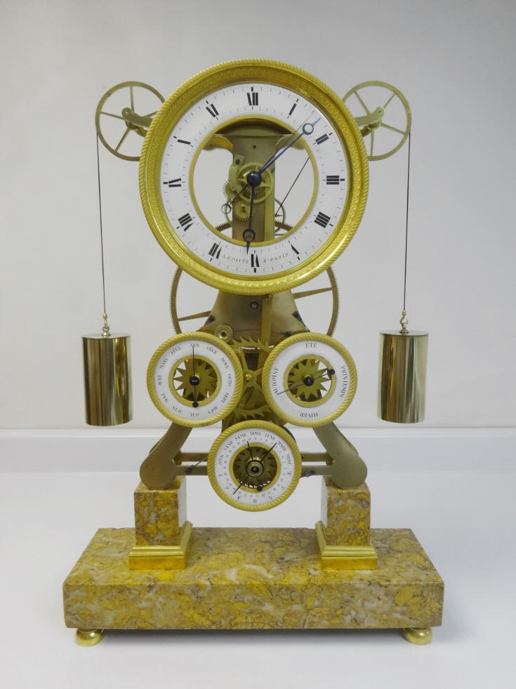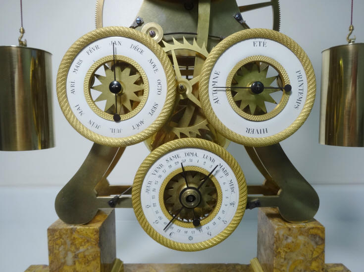 and passive strike on the half-spring driven, gilt bezels and enamel dials indicating the day, day's zodiacal sign, date, month and season, 2 week duration